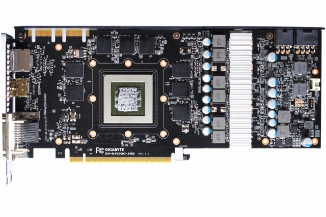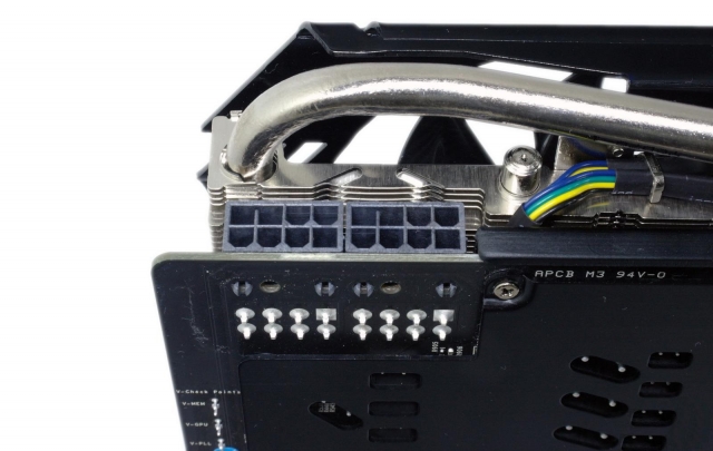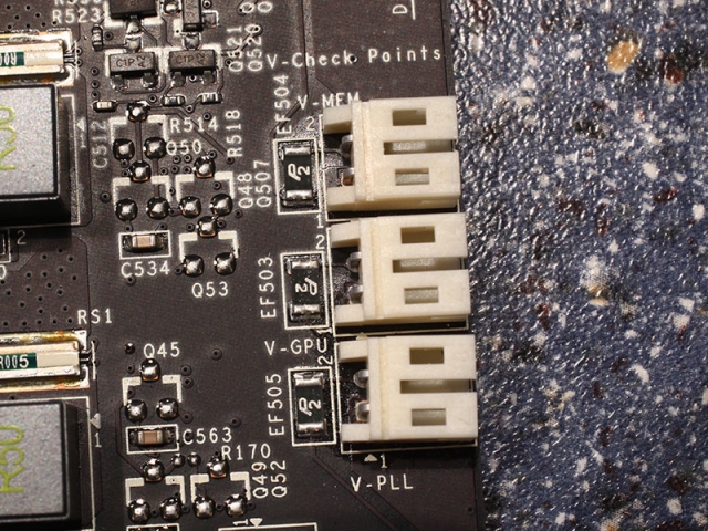 Близкое расположение к разъемам дополнительного питания системы охлаждения немного затрудняет отсоединение кабелей питания. Специальные разъемы для замера питающего напряжения на графическом процессоре, видеопамяти и PLL распаяны в задней части печатной платы.