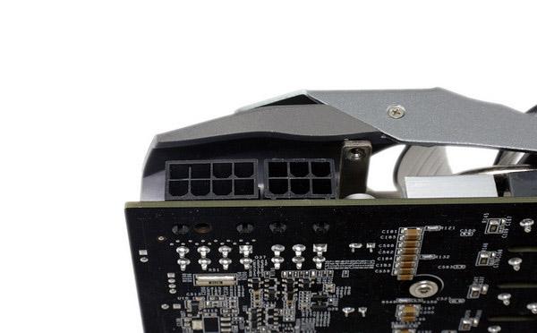 Подсистема питания видеокарты состоит из 8 фаз. Две фазы питают видеопамять, а остальные 6 - графический процессор. Управляет фазами питания графического процессора контроллер NCP4208 от компании ON Semiconductor. Дополнительное питание на видеокарту подается через разъемы 6-pin и 8-pin. Номинальная частота графического процессора увеличена до 1085 МГц. Микросхемы видеопамяти Hynix H5GQ2H24AFR работают на стандартной частоте 6008 МГц.