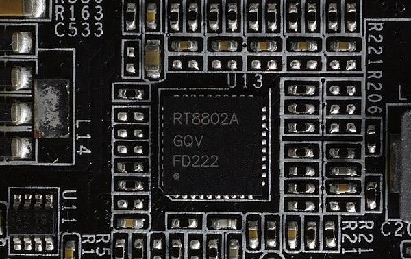 Подсистема питания видеокарты получила 7 фаз. Дополнительная фаза питания используется в цепи питания графического процессора. Теперь он питается по пятифазной схеме. Видеопамять, как и на стандартной модели запитана от двух фаз. Управление фазами питания графического процессора возложено на контроллер RICHTEK RT8802A.