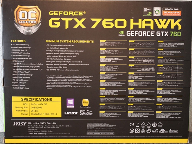 Из ярлыков размещенных справа на передней панели пользователь может узнать об объеме и типе видеопамяти, о примененной на видеокарте системе охлаждения и о заводском разгоне. Технические характеристики видеокарты вместе с описанием системы охлаждения размещены на обратной стороне упаковочной коробки.