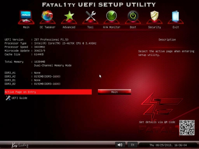 BIOS материнской платы оформлен в красно-черных тонах, характерных для серии Fatal1ty. BIOS имеет следующие разделы: Main, OC Tweaker, Advanced, Tool, H/W Monitor, Boot, Security. При входе в BIOS пользователь сразу оказывается в разделе Main, в котором расположены общие сведения о системе. При желании пользователь может изменить стартовый раздел с помощью функции Active Page on Entry. Кратко остановимся на остальных разделах BIOS: