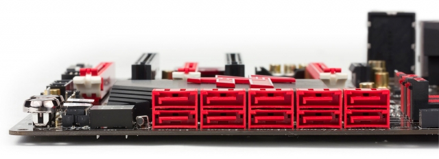 Для создания дисковой подсистемы, а также подключения оптических приводов на материнской плате распаяно 10 разъемов SATA 6 Гбит/с. Все разъемы окрашены в красный цвет и имеют угловое подключение. SATA разъемы с угловым подключением не мешают установке длинных видеокарт. Системная логика Intel Z87 поддерживает работу 6 из 10 разъемов. Работа остальных 4 разъемов SATA реализована с помощью двух контроллеров ASM1061 от компании ASMedia. К одному из дополнительных контроллеров подключен разъем eSATA 6 Гбит/с. При подключении устройства к данному разъему один из разъемов SATA отключается. Все SATA разъемы на данной плате поддерживают RAID массивы уровней 0, 1, 5, 10.