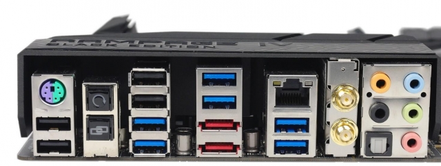 Кроме разъемов на заднюю панель выведены две кнопки Clear CMOS и ROG Connect / BIOS Flashback.