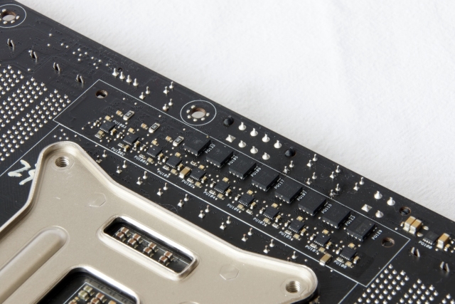 С лицевой стороны силовые элементы охлаждаются с помощью двух радиаторов, соединенных между собой тепловой трубкой. Непосредственно с силовыми элементами контактирует только один радиатор, тогда как второй служит для более эффективного теплораспределения. С обратной стороны платы силовые элементы охлаждает металлическая пластина.