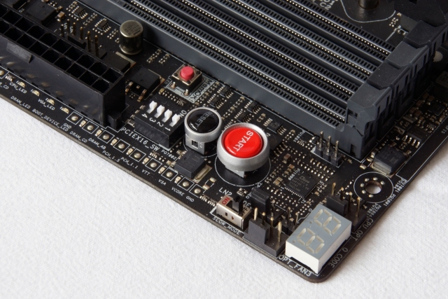 Здесь расположены три кнопки: «Start», «Reset», «MemOK!». Назначение первых двух кнопок вполне понятное. При нажатии кнопки «MemOK!» система автоматически установит оптимальные параметры для установленных модулей оперативной памяти. Рядом с кнопками находятся два микропереключателя: «Slow Mode» и «PCIEХ16_SW». Первый активирует режим, при котором параметры разгона системы вступают в силу после загрузки операционной системы. Второй микропереключатель позволяет выборочно отключать слоты PCI-Express x16. С помощью специальных перемычек (джамперов) пользователь может активировать режим LN2 Mode, который рекомендуется активировать при разгоне с использованием жидкого азота. В данном режиме повышается стабильность системы при работе на отрицательных температурах. Также на плате нашлось место для индикаторов POST кодов и контактным площадкам для замера напряжений питания. Материнская плата оснащена двумя микросхемами BIOS, переключаться между которыми можно с помощью кнопки BIOS Switch, которая расположена на нижнем крае материнской платы. Рядом с ней расположена кнопка прямого доступа к настройкам BIOS – DirectKey. Ну а теперь рассмотрим OC Panel и ее функции.