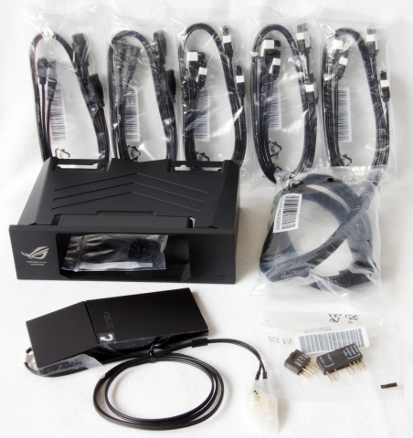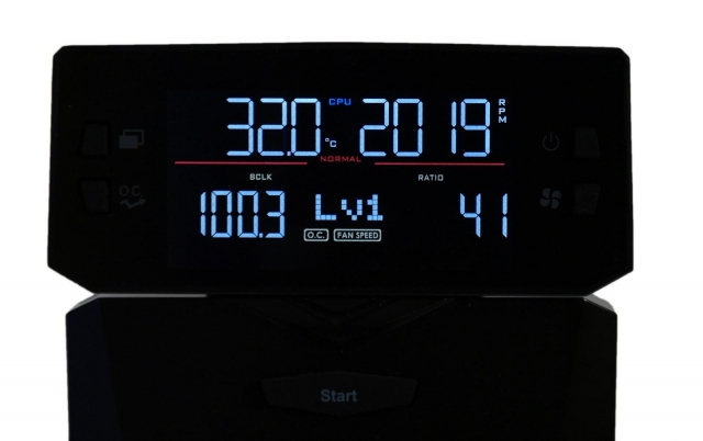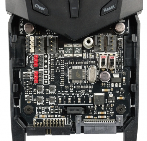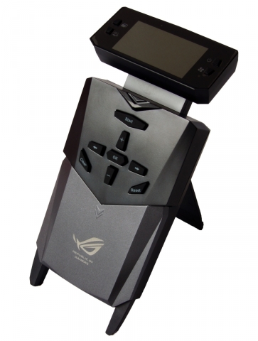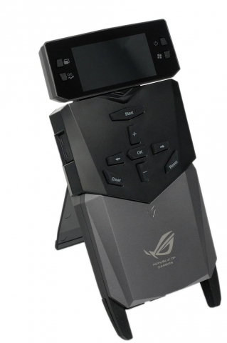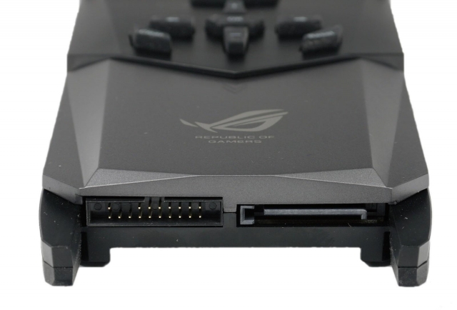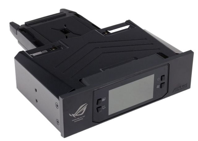 Модуль выполнен из пластика, имеет прорезиненные кнопки и поворотный дисплей. Внизу модуля расположены разъем для подключения к материнской плате (к колодке ROG_EXT) и разъем SATA для подачи питания на модуль.