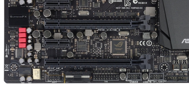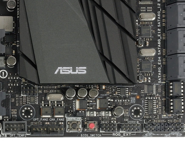 На плате расположены колодки: SPDIF _OUT, TMP, две колодки USB 2.0, USB 3.0, колодка ROG_EXT и колодка подключения передней панели. К колодкам на плате можно подсоединить до 6 разъемов USB 2.0 и два разъема USB 3.0. Работа всех разъемов USB 2.0 реализована набором системной логики. Работа разъемов USB 3.0 реализована силами контроллерами ASMedia ASM1074 и ASMedia ASM1042.
