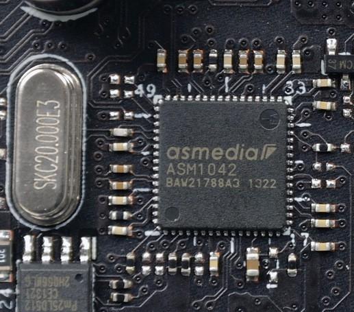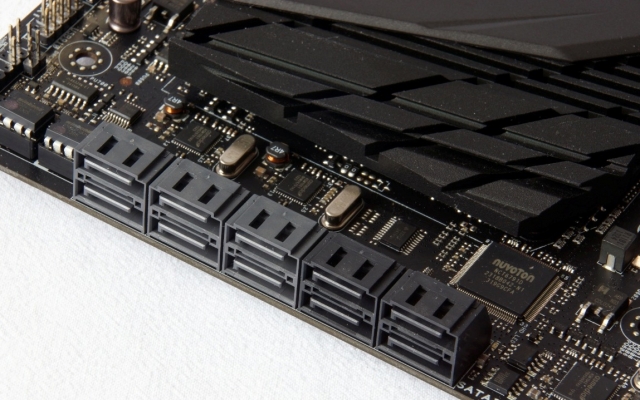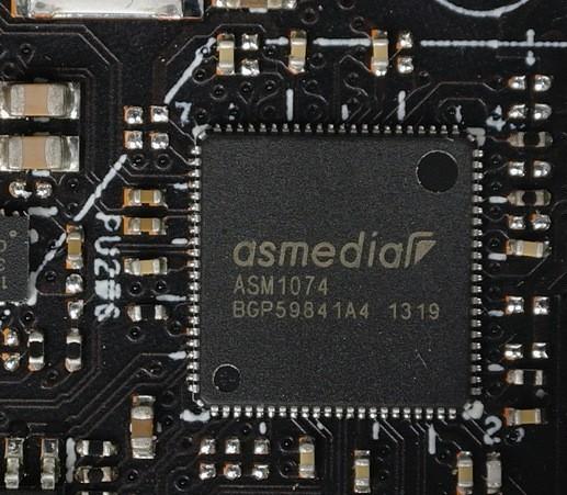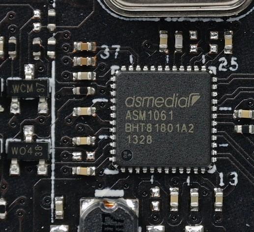 Черные разъемы имеют поддержку SATA 6 Гбит/с, в то время как серые - SATA 3 Гбит/с. Набор системной логики обеспечивает работу только двух разъемов SATA 6 Гбит/с и четырех разъемов SATA 3 Гбит/с. Работу остальных разъемов SATA обеспечивают три контроллера ASMedia ASM1061.