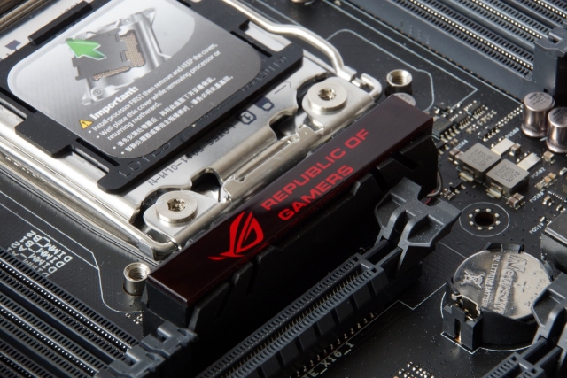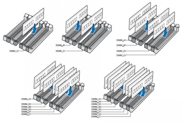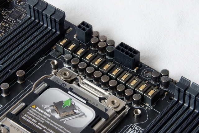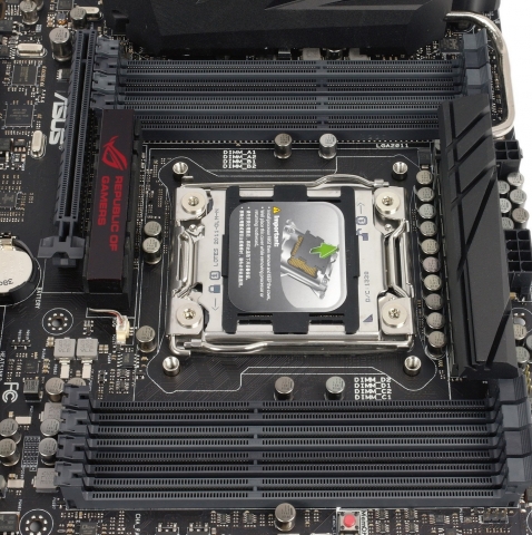 Отличительной особенностью платформы LGA2011 от других настольных платформ является поддержка 64 Гб оперативной памяти. Для этих целей на плате распаяно 8 разъемов DIMM, которые расположены справа и слева от процессорного разъема.