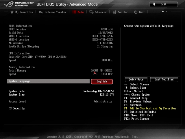 Графическая оболочка BIOS материнской платы ничем кроме цветового оформления не отличается от других плат компании ASUS. BIOS платы имеет черное оформление и разбит на следующие разделы: Extreme Tweaker, Main, Advanced, Monitoring, Boot. В раздел Extreme Tweaker пользователю предоставляют широкие возможности по настройке и разгону системы. Пользователь может самостоятельно задать различные параметры или воспользоваться предустановленными профилями. Раздел Main содержит основную информацию о системе. Раздел Advanced позволяет более точно настроить работу различных контроллеров на материнской плате. В разделе Monitoring пользователь может контролировать напряжения питания, температуру и скорость вращения вентиляторов. Здесь также можно установить различные профили работы вентиляторов. Раздел Boot содержит параметры загрузки системы. В этом разделе можно произвести обновление BIOS и сохранить профили с настройками.