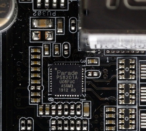 Разъемы HDMI, DisplayPort и mini DisplayPort служат для подключения к встроенному в центральный процессор графическому ядру. Переключение между разъемами осуществляется микросхемой Parade PS8201A.