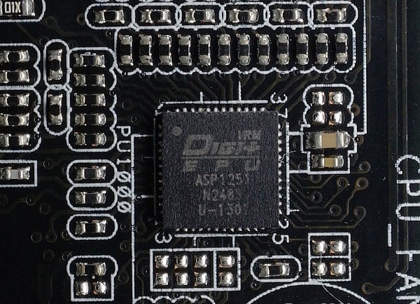 Модули оперативной памяти питаются по двухфазной схеме. Управляет фазами питания контроллер ASP1103, который тоже обладает технологией DIGI+.