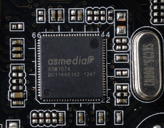 Помимо указанных разъемов на плате распаян ряд колодок для подключения дополнительных разъемов (планок с разъемами). К колодкам на плате можно подключить четыре разъема USB 2.0 и два разъема USB 3.0. Работа дополнительных разъемов USB 3.0 реализована с помощью USB хаба ASMedia ASM1074.