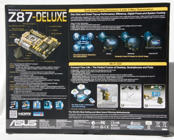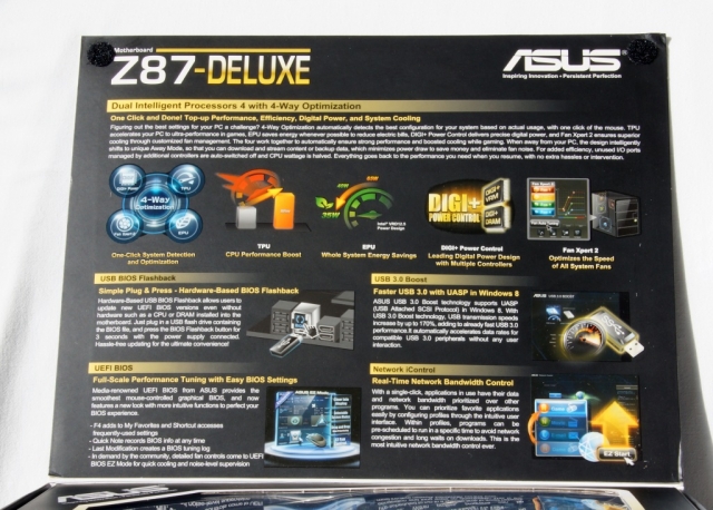 Ярлыки из нижнего ряда сообщают пользователю о ряде фирменных технологий, которые объединены в концепцию 4-Way Optimization, а также о наличии модуля Wi-Fi/Bluetooth на материнской плате. Верхние ярлыки сообщают о поддержке массивов видеокарт, а также о поддержке ряда звуковых эффектов. Передняя панель упаковочной коробки выполнена в виде откидной крышки. На внутренней ее стороне расположено подробное описание ряда фирменных технологий.
