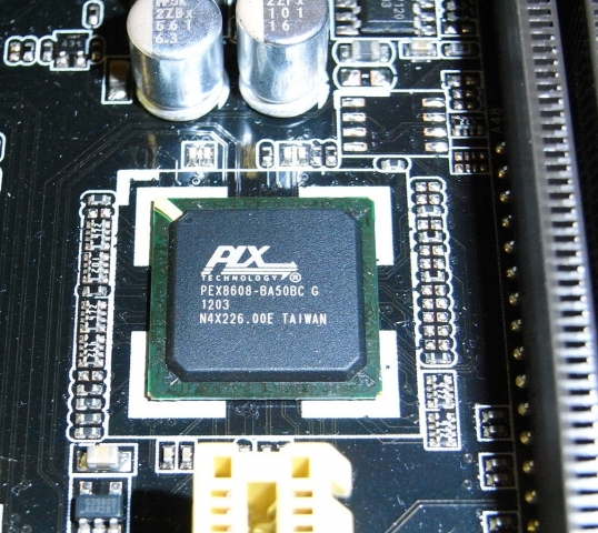 Для организации видеоподсистемы на плате распаяны три разъема PCI Express х16. Два верхних из них используют линии PCI Express центрального процессора и имеют спецификацию V3.0. Третий разъем подключен к чипсету и имеет спецификацию V2.0. Первые два разъема могут работать в режимах: х16 + х0 или х8 + х8. Третий разъем всегда работает в режиме х4. Помимо указанных выше разъемов на плате распаяны четыре разъема PCI Express х1 для плат расширения. Для получения необходимого количества линий PCI Express на печатной плате распаян дополнительный коммутатор PLX PEX 8608.