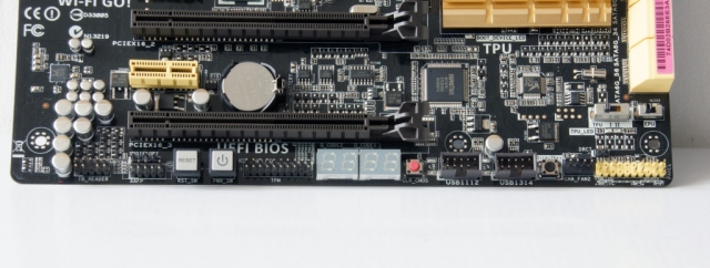 На нижнем краю платы вместе с колодками размещено несколько кнопок. Здесь находятся кнопка POWER (питание), RESET (сброс), CLR_MOS сброс параметров (BIOS) и DirectKey (быстрый доступ к BIOS). Там же расположены и индикаторы POST кодов.