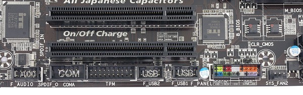 Здесь расположены колодки для подключения аудиоразъемов передней панели, COM порта, модуля TPM (Trusted Platform Module) и две колодки для разъемов USB. Еще одна колодка для USB разъемов расположена рядом с разъемом питания 24-pin.