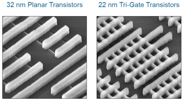 Это позволило снизить токи утечки, увеличить скорость переключения и повысить общую плотность компоновки элементов. Повышение плотности компоновки элементов позволило уменьшить площадь кристалла с 435 мм (Sandy Bridge E) до 257 мм (Ivy Bridge-E).
