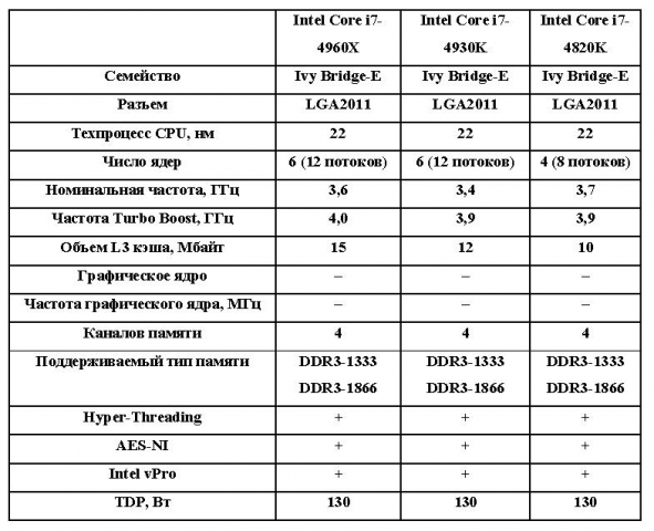 На этот раз презентация шестиядерных и четырехъядерных моделей прошла одновременно. Флагманом семейства Ivy Bridge-E стала шестиядерная модель Intel Core i7-4960X. По сравнения с флагманом прошлого семейства номинальная частота Core i7-4960X увеличилась на 100 МГц с 3500 МГц до 3600 МГц. В режиме Turbo Boost частота может увеличиваться до 4000 МГц. Таким образом при пиковой нагрузке на все шесть ядер новая модель будет чуть быстрее. Вместе с тем уровень TDP у семейства Ivy Bridge-E составляет 130 Вт что на 20 Вт меньше чем у Sandy Bridge E. Еще одна шестиядерная модель в линейке получила индекс Core i7-4930К и пришла на смену Core i7-3930К. Базовая частота данной модели по сравнению с Core i7-3930К тоже увеличилась на 100 МГц. Единственная четырехъядерная модель Core i7-4820K работает на базовой частоте 3700 МГц. Процессоры Ivy Bridge-E получили разблокированный множитель и официальную поддержку шины PCI Express 3.0. Ниже представлю основные характеристики новых моделей.