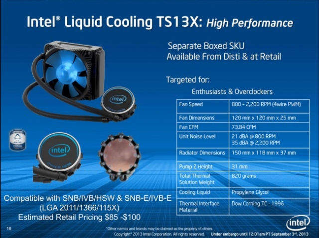 Потенциальным покупателям необходимо обратить внимание на отсутствие в комплекте поставки системы охлаждения. Благодаря уровню TDP в 130 Вт подобрать системы охлаждения не составит большого труда. Как один из вариантов можно приобрести системы жидкостного охлаждения от Intel – Intel Liquid Cooling TS13X.