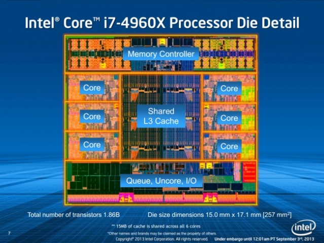 Но, здесь нужно отметить тот факт, что прошлое поколение (Sandy Bridge E) имело на своем кристалле восемь ядер, два из которых были отключены инженерами на технологическом уровне. Такое решение было связано с тем, что у компании Intel не было на тот момент шестиядерных моделей. Серверные процессоры Xeon имели восемь ядер. Компания посчитала невыгодным разработку и выпуск нового шестиядерного кристалла и приняла решение использовать кристаллы для процессоров Xeon с двумя отключенными ядрами. Для появившейся чуть позже модели Intel Core i7-3820 уже использовался новый кристалл.