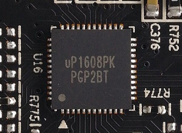 Четыре фазы питают графический процессор и одна фаза питает видеопамять. В качестве контроллера используется микросхема mP1608PK.
