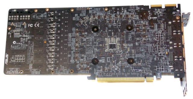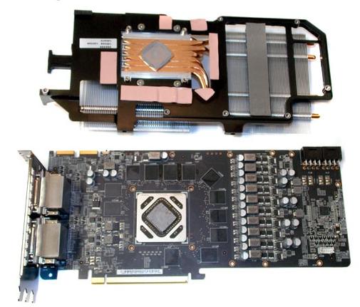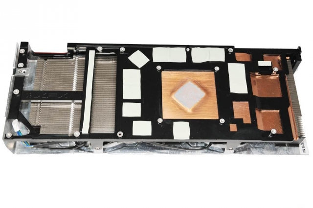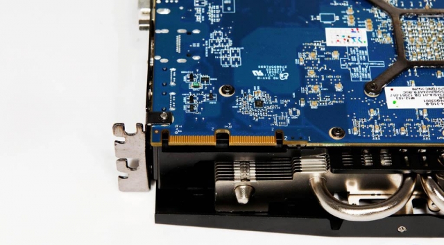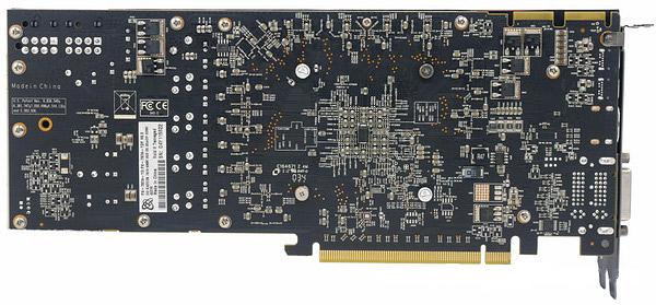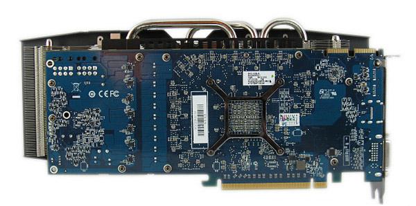 Для увеличения жесткости системы охлаждения с обратной стороны видеокарты установлена металлическая пластина. Дополнительный радиатор для полевых транзисторов в цепи питания пригодится в случае замены штатной системы охлаждения на более производительную или при разгоне видеокарты с использованием жидкого азота. Тепловые трубки контактируют непосредственно с графическим процессором.