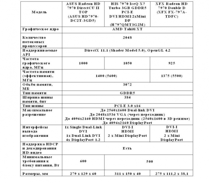 На протяжении нескольких лет компания AMD представляла новые поколения видеокарт раньше основного конкурента – компании Nvidia. Но после выпуска Nvidia новой 700 серии видеокарт ситуация на рынке изменилась. Теперь AMD приходится выступать в роли догоняющей компании. Анонс нового поколения видеокарт от AMD предварительно запланирован на середину осени. А пока конкурировать с новыми видеокартами от Nvidia будут видеокарты Radeon HD 7950, HD 7970 и HD 7990, которые благодаря снижению цен обладают неплохим соотношением цена/производительность. В данном тестировании рассмотрим три видеокарты Radeon HD 7970 в исполнении ASUS, HIS и XFX. Характеристики тестируемых видеокарт укажу в таблице.