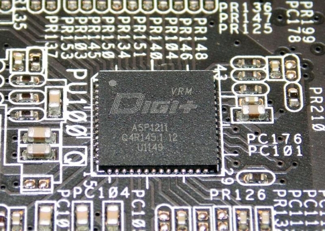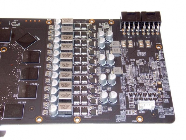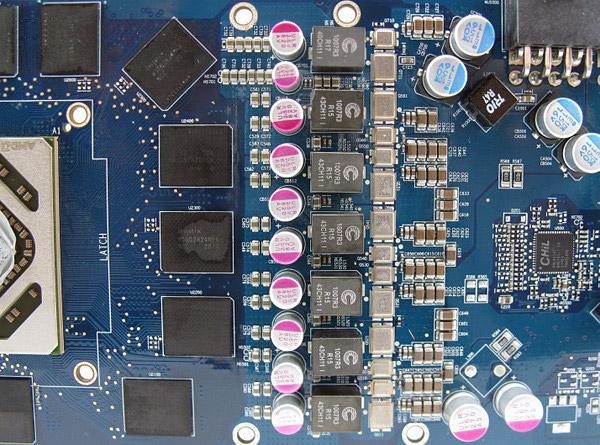 Восемь фаз обеспечивают питание графического процессора и две - питание видеопамяти. Управляет фазами питания микроконтроллер ASP1211, который поддерживает активное переключение между фазами и отключает неиспользуемые фазы в режиме малой нагрузки.