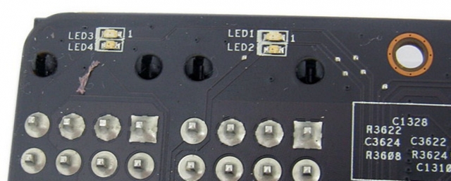 Возле разъемов дополнительного питания с обратной стороны печатной платы расположены светодиоды, которые информируют пользователя об их активности.