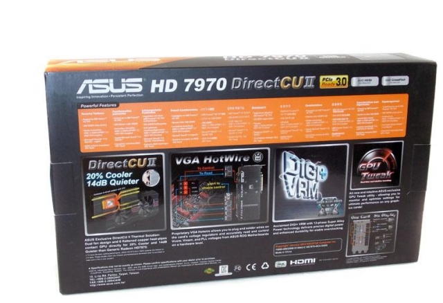 На обратной стороне упаковочной коробки размещена спецификация видеокарты. Ниже кратко рассказано о системе охлаждения Direct CUII, технологиях VGA HotWire и Digi+VRM и о программе GPU Tweak.