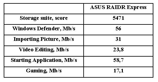 В тестовом пакете Futuremark PCMark 7, имитирующем повседневную работу, показатели накопителя ASUS RAIDR Express сопоставимы с показателями SSD накопителей с интерфейсом SATA 6 Гбит/с.