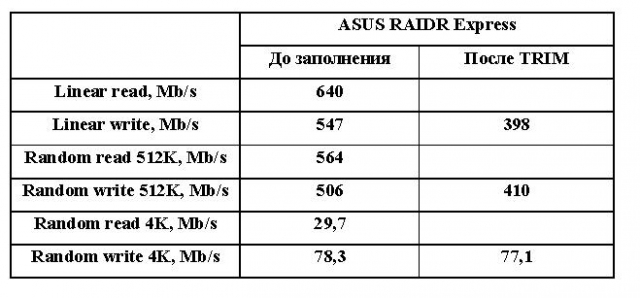 Тестирование программой CrystalDiskMark наглядно показало, что твердотельный накопитель ASUS RAIDR Express действительно имеет проблемы при работе с мелкими файлами. Скорость чтения/записи была существенно снижена. Также данный тестовый пакет подтвердил тот факт, что даже после подачи команды TRIM скорость записи у накопителя не вернулась к первоначальному значению. Потери в скорости составляют порядка 20-25% и не наблюдаются только при работе с мелкими файлами.