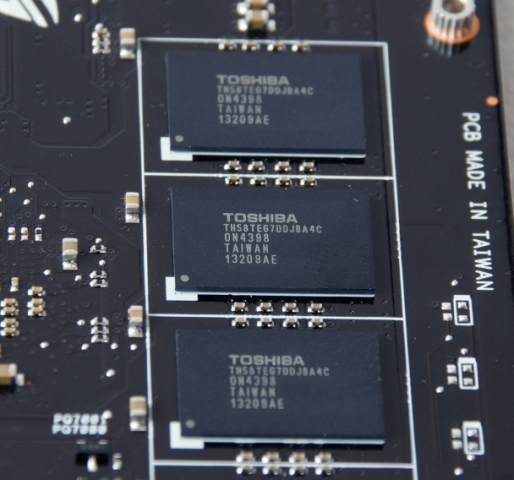 Помимо трех контроллеров на печатной плате распаяно шестнадцать (по восемь с каждой стороны) микросхем памяти Toggle NAND MLC производства Toshiba. Емкость каждой микросхемы составляет 16 Гб, а общий объем накопителя составляет 256 Гб. Но пользователю доступны 240 Гб, а остальные зарезервированы для нужд самого накопителя (для хранения контрольных сумм циклических кодов и «подменного фонда» ячеек памяти, компенсирующих неравномерный износ). Микросхемы памяти изготовлены по 19-нм техпроцессу. На микросхемы нанесена маркировка - TH58TEG7DDJBA4C.