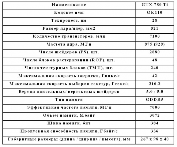 Ранее такой процессор использовался исключительно в профессиональной видеокарте Quadro K6000. В связи с этим можно говорить о возросшей на 20 % производительности при выполнении шейдерных инструкций и текстурирования. Номинальная частота процессора по сравнению с GTX 780 Ti немного подросла и составляет 875 МГц (928 МГц в режиме GPU Boost). Увеличение пропускной способности видеопамяти было достигнуто за счет использования микросхем с номинальной частотой 7000 МГц. Ранее видеопамять с такой частотой применялась исключительно на видеокартах GTX 770. Пропускная способность видеопамяти составляет рекордные 336 Гбайт/с. Объем видеопамяти решили оставить равным 3 Гб. Основные характеристики видеокарты приведу в таблице.