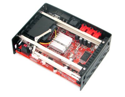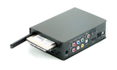 Если вскрыть корпус можно увидеть внутреннее устройство плеера. Первое что встаёт перед взором это слот для жёсткого диска. В конструкции слота присутствует рычаг, который соединённый с крышкой на корпусе. При открытии крышки рычаг быстро выдвигает накопитель, и извлечь его становится очень просто.