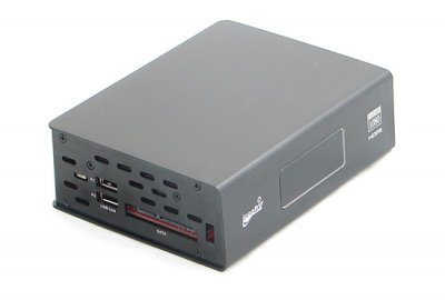 Корпус устройства изготовлен из алюминия покрытого чёрной краской. На лицевой стороне расположен индикатор питания и инфракрасный датчик пульта дистанционного управления. На левой боковой стороне расположен порт SATA, при помощи которого без проблем можно подключить обычный жёсткий диск, не используя при этом внешний бокс и блок питания.
