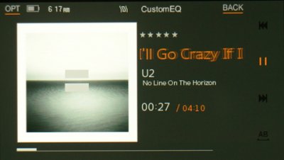 В окне воспроизведения, стандартно, отображается – название композиции, альбома и исполнителя, общее время композиции, время которое прошло, полоса прогресса, клавиши (сенсорные) паузы, перемотки вперед и назад. Также присутствует клавиша АВ, которая может зацикливать определенный участок композиции. Также имеются значки заряда батареи, режима эквалайзера и клавиша вызова контекстного меню. Кроме информации о композиции, может отображаться обложка альбома. Ее размер изменяется прикосновением.