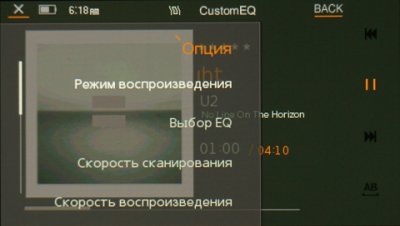 Режим воспроизведения может быть обычным, с повтором, со случайным выбором, со случайным выбором и повтором. Можно изменять скорость воспроизведения и перемотки в 32раза. Но проще использовать не перемотку, а просто коснуться пальцем участка полосы прогресса в нужном месте. Еще возможна перемотка с помощью. Если функция Time Scroll включена, то при вращении цилиндра будет производиться перемотка. Если же функция отключена, то вращение приведет к переходу на предыдущий или следующий трек.