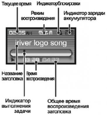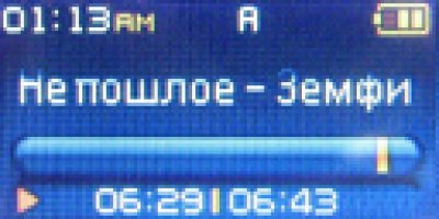 Не смотря на маленькие размеры, дисплей довольно информативный, правда символы тоже маленькие. На экране в процессе воспроизведения отображаются часы, режим воспроизведения, индикатор блокировки, заряд батарейки, название композиции, индикатор выполнения задачи, время воспроизведения и общее время композиции.