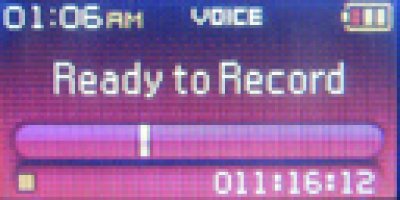 Запись возможна только через встроенный микрофон, так как линейный вход отсутствует. Формат файлов МР3, сохраняются они в отдельную директорию Recordings, в которой имеется две папки – Voice (диктофон) и FM (радио). Также можно настраивать качество - high (256 кбит/сек), middle (128 кбит/сек) и end (64 кбит/сек). Записанный звук получается, на удивление, неплохим. Конечно звучание моно, но басы все же прослушиваются.