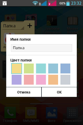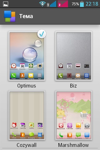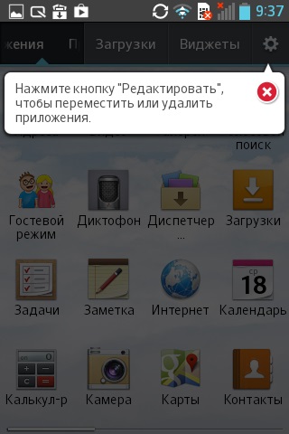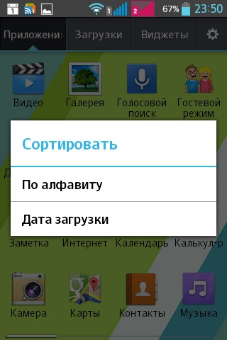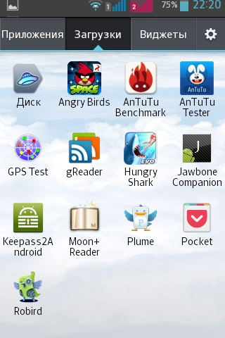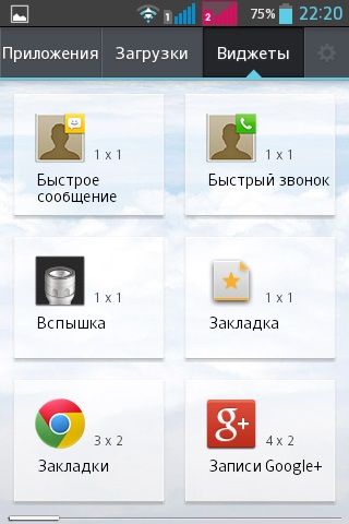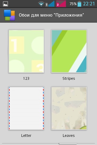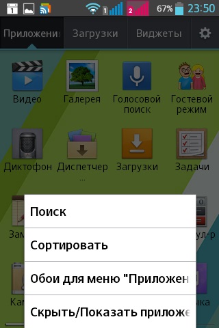 Меню приложений содержит следующие группы: приложения, загруженные приложения, виджеты. Для меню можно выбрать специальные обои.