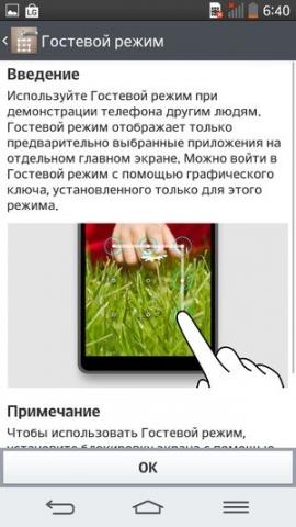 В LG G2 имеется специальный режим Guest Mode. Это гостевой режим, который позволяет давать смартфон в руки коллег или знакомым, не боясь того, что кто-то может увидеть личную информацию. Для доступа к личным данным необходимо ввести пароль.