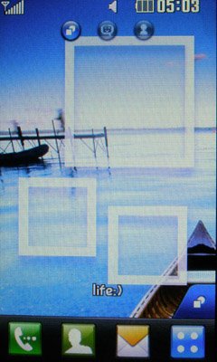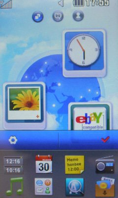 Главная страница дисплея выполнена в виде 3-х граней, каждая из которых имеет свой функциональный потенциал. Меню виджетов реализовано на первой грани. Оно проработано в виде строки, содержащей 15 ярлыков виджетов. Все ярлыки при желании можно вынести на панель, а затем слегка встряхнуть телефон и при помощи системы автоматического выравнивания упорядочить иконки.