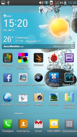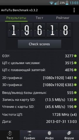 Компания LG, беспокоясь о чрезмерном нагреве своих смартфонов, сознательно уменьшает возможности аппаратной платформы, что приводит не к самым высоким результатам синтетических тестов. В AnTuTu аппарат набирает 19618 баллов. Убрав ограничения, можно получить очень высокий результат в 25133 балла.