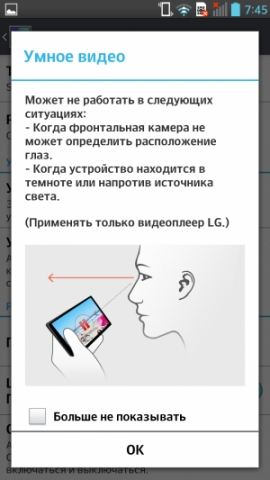 Как и топовые устройства от Samsung, LG Optimus G Pro обладает набором «умных» функций, позволяющих управлять смартфоном с помощью жестов и взглядов. Эти функции работают при помощи фронтальной камеры. Так, например, если пользователь отведёт взгляд от экрана, на котором через штатный видеоплеер воспроизводится видео, то воспроизведение тут же поставится на паузу.