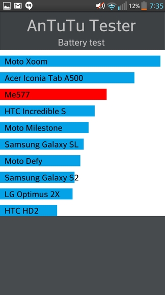 В бенчмарке Antutu Tester устройство набрало 577 баллов, продержавшись без подзарядки 3 часа 13 минут. Для сравнения LG Optimus G набирает 611 баллов и работает от одного заряда батареи при максимальной нагрузке на 11 минут дольше.