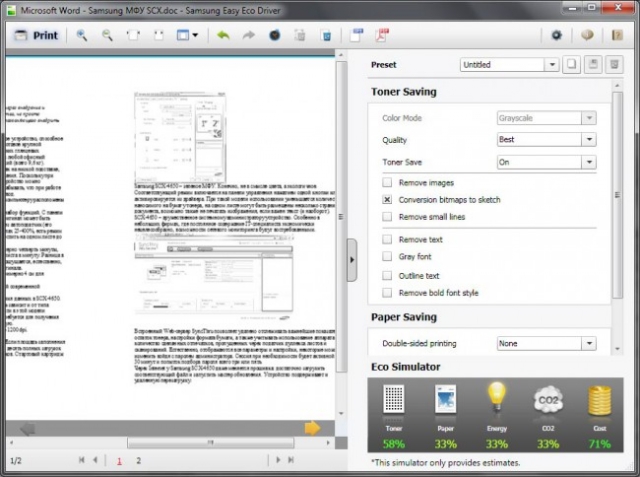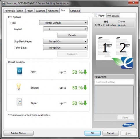 Владелец МФУ Samsung SCX-4650N может пользоваться фирменной программой Samsung Easy Eco Driver при отправке задания на печать. Данная программа является простым и наглядным средством для настройки различных параметров экономии. Пользователю не придётся каждый раз выбирать одни и те же опции, так как ему достаточно сохранить пару часто используемых шаблонов, содержащих необходимые наборы параметров.