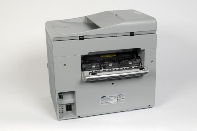 На тыльной панели многофункционального устройства Samsung SCX-4650N размещены разъем для подключения электропитания, разъем USB 2.0, используемый для подключения к компьютеру, и Ethernet-порт.