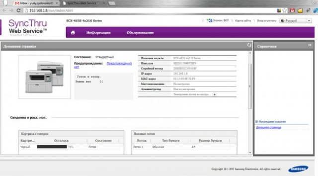 Модель Samsung SCX-4650N предоставляет пользователю широкие возможности сетевого управления и мониторинга. Отслеживать важные показатели, такие как настройки формата бумаги, остаток тонера, количество сделанных отпечатков сканирований и другие параметры, удалённо позволяет встроенный Web-сервер под названием SyncThru. Входя на сервер с паролём администратора, пользователь помимо просмотра всех параметров и настроек может изменять их. Сессия при этом активна полчаса, а попыток подбора пароля всего три штуки.